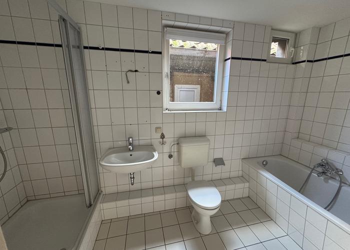 - Badezimmer Ausstattung: Dusche, Badewanne, Fenster, Waschmaschinenanschluss